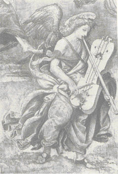 Anche se possiamo certamente affermare che tale strumento fosse in uso già dal XIII sec., la prima testimonianza la incontriamo nella Cappella Carafa della chiesa di S. Maria sopra Minerva a Roma, uno degli angeli musicanti presente nell'affresco di Filippino Lippi (1488-1493) suona un flauto a tre buchi molto lungo con la sinistra, e percuote il buttafuoco a tre corde con la destra. Il buttafuoco ha il corpo a forma di viola ed è appeso con una cinghia al collo dell'angelo.